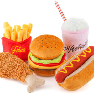 French fries: amusing crinkly packaging with 3 bunches of squeaky fries. Tips: Hide treats inside for fun interactive play.
