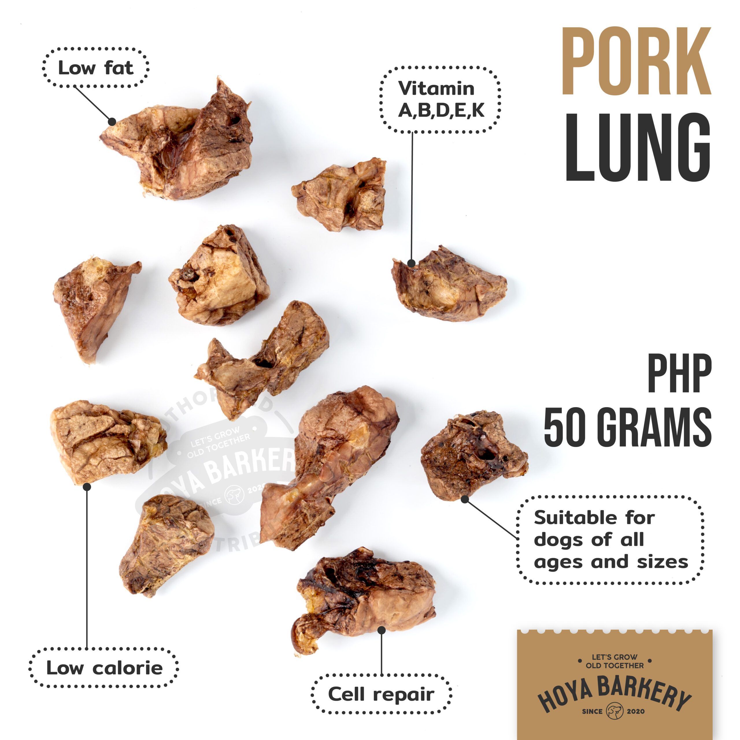 Lung puffs contain vitamins and minerals that help repair cells, supports brain health, and strengthen the immune system. Lung puffs have light airy texture making it mouthful while maintaining low calorie. It is an equivalent of marshmellow in the dog world.
